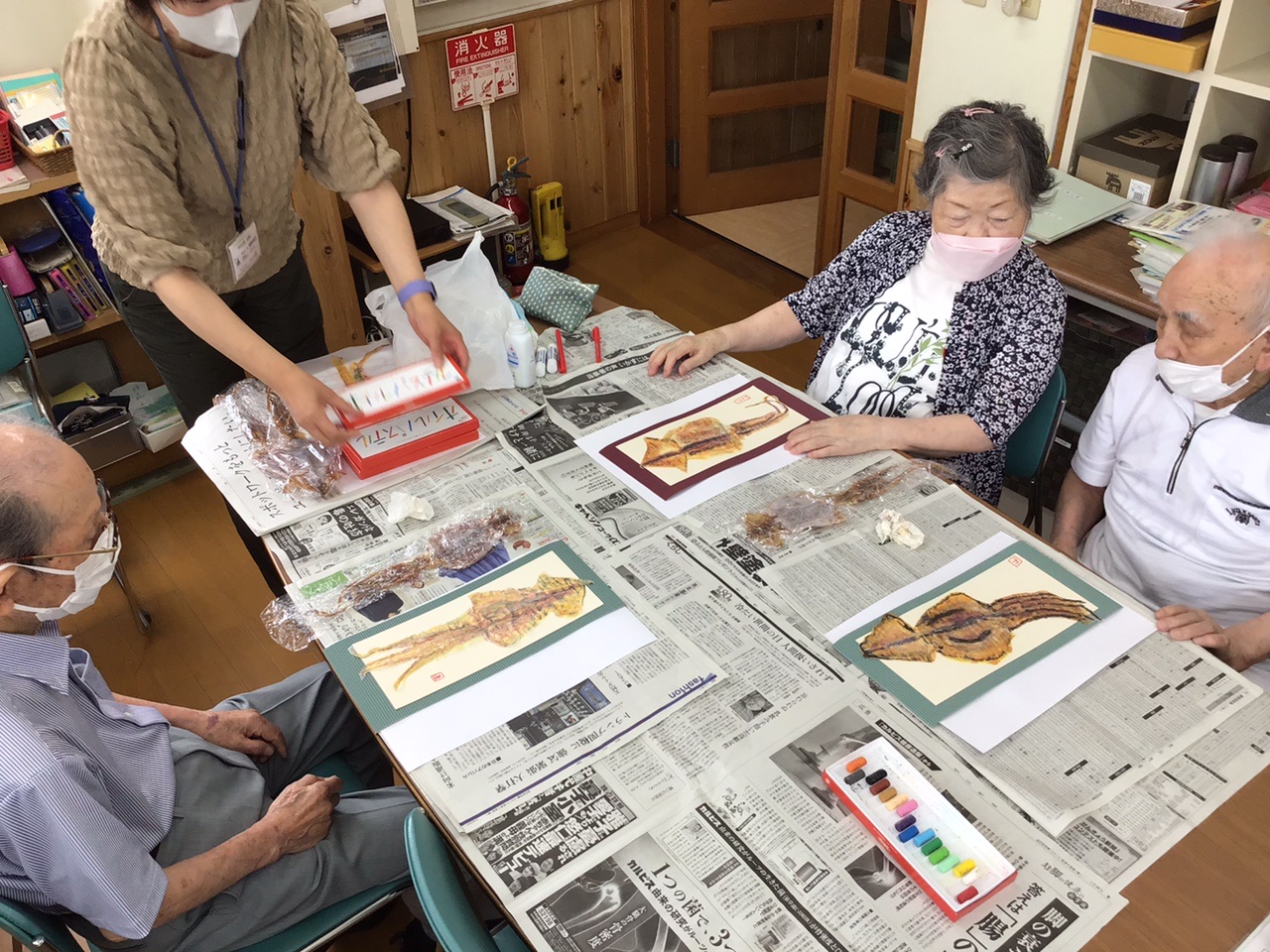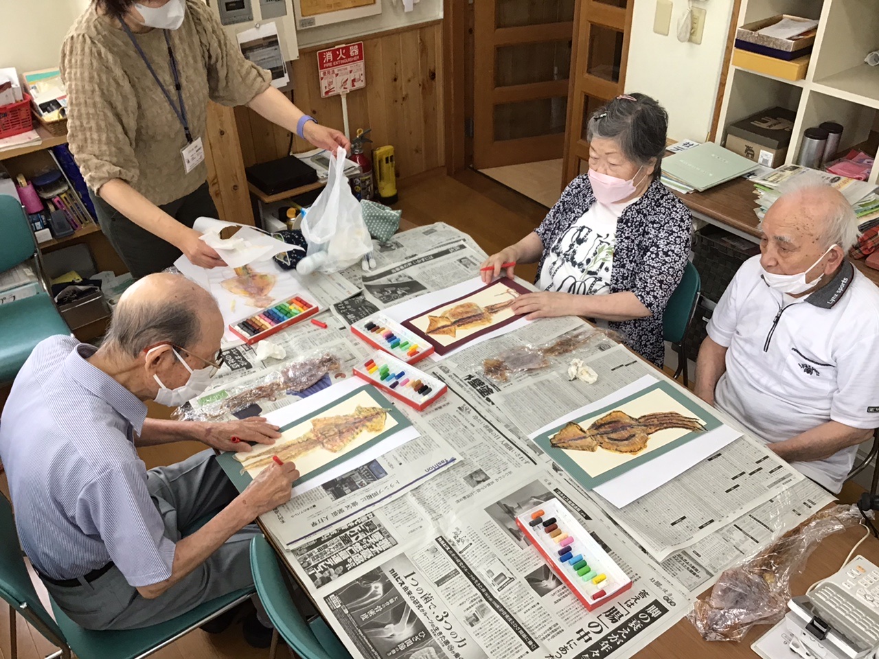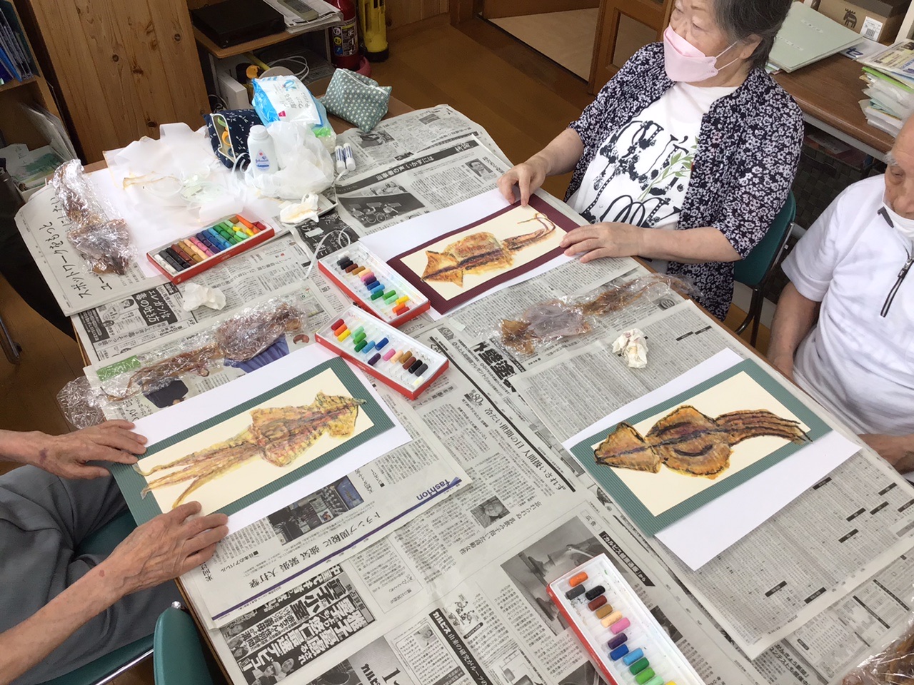 本日は臨床美術士の森重さんが来られ、絵画教室が行われました。今回のお題は「スルメイカを描く」です。